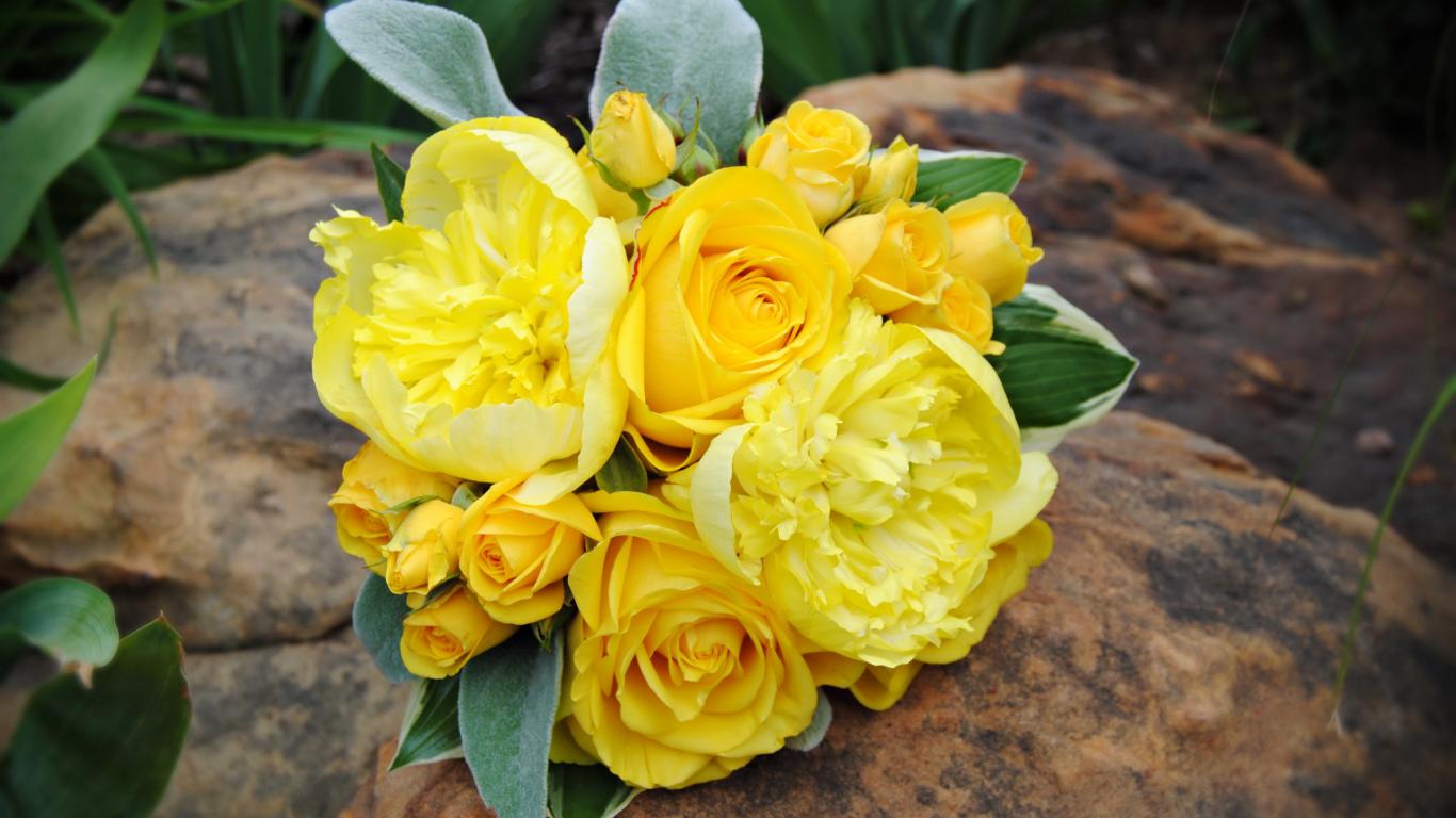Обои Букет желтых роз с желтыми пионами лежит на камне