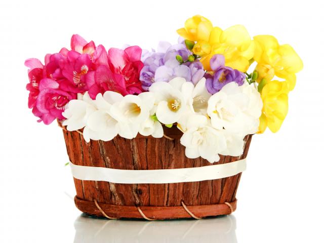 Обои Корзина разноцветных цветов Фрезия на белом фоне