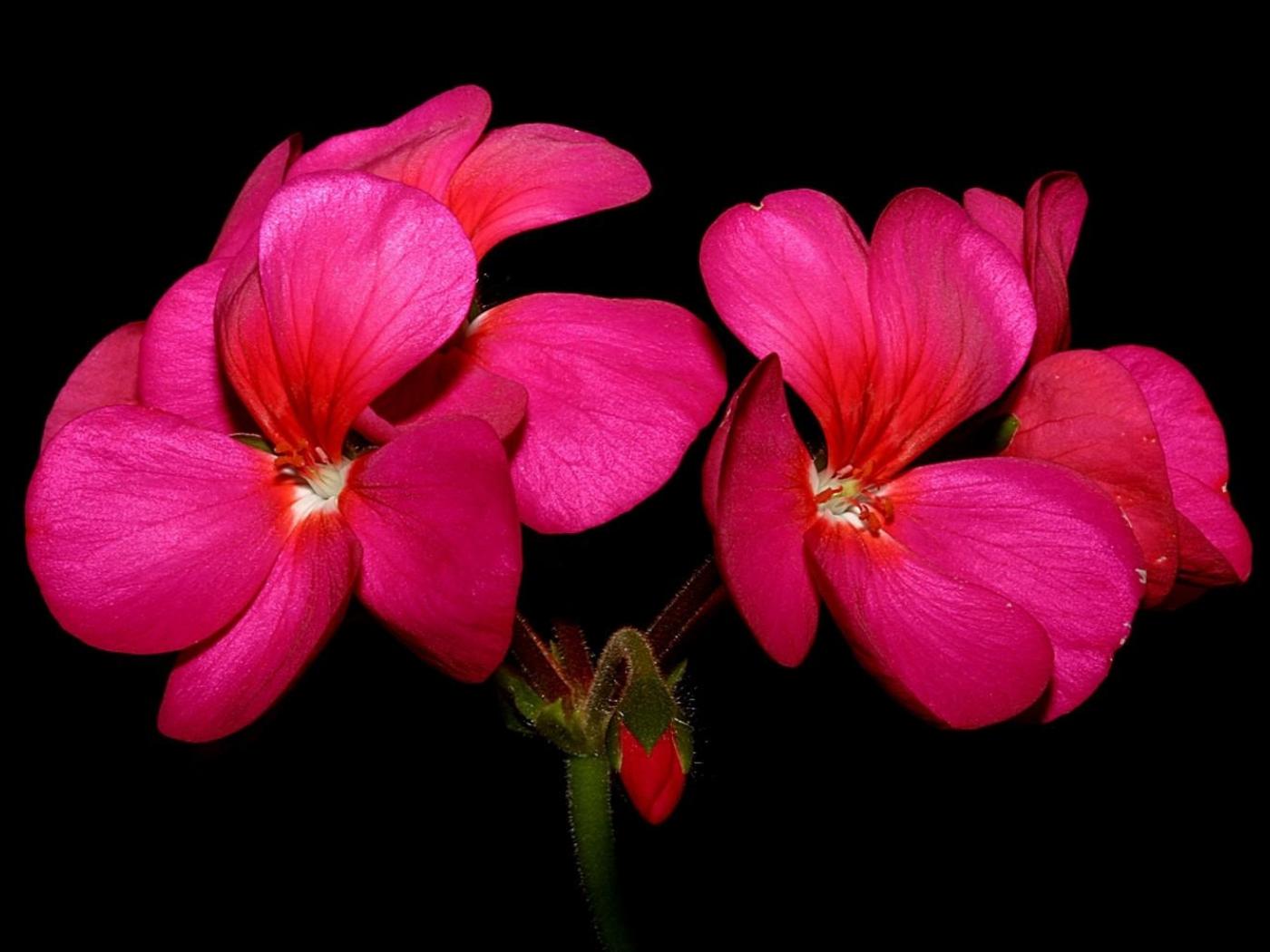 Обои Красные цветы герани на черном фоне крупным планом