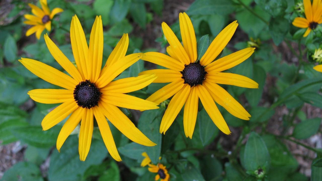 Обои Два крупных желтых цветка рудбекия