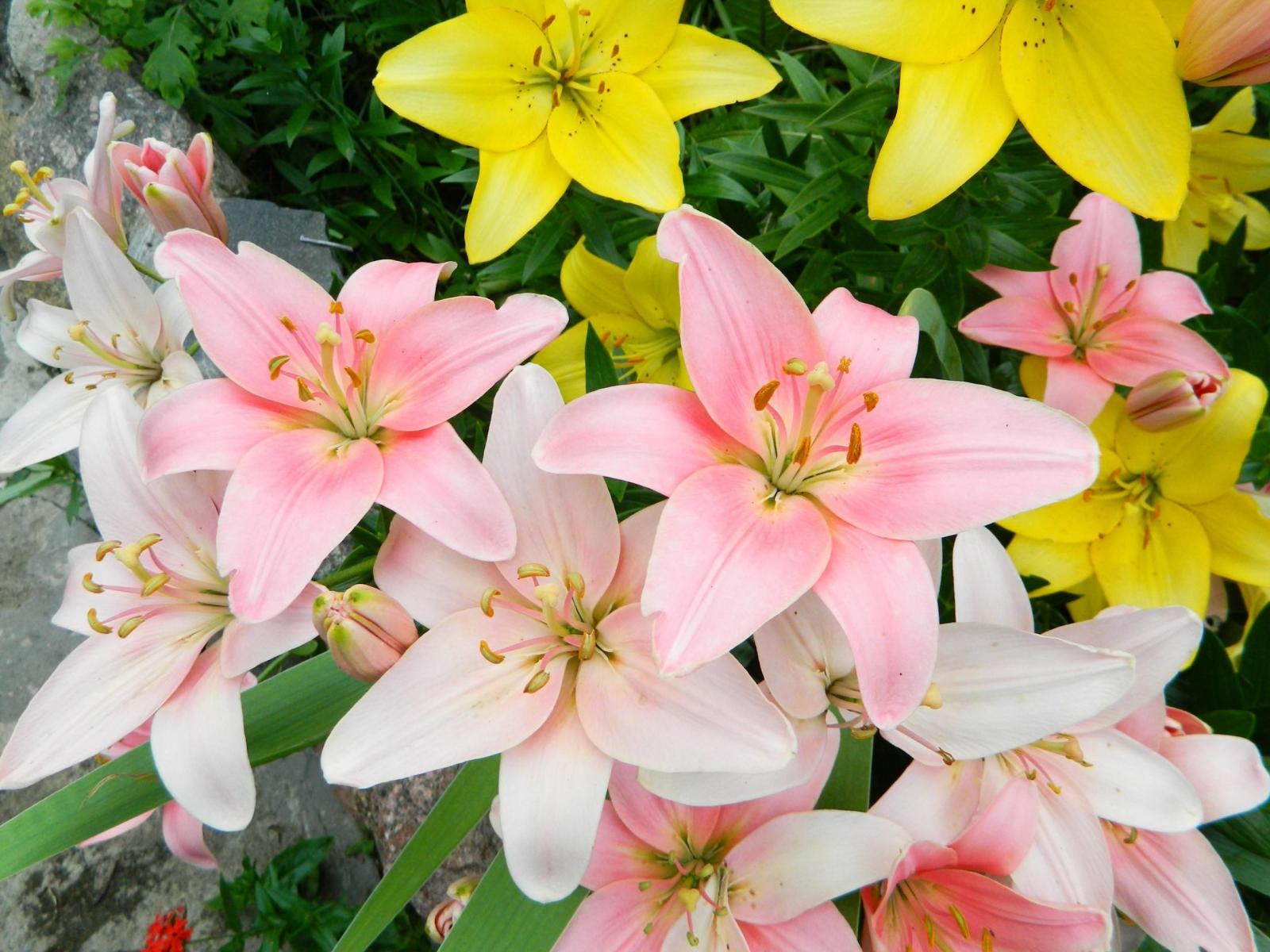 Обои Яркие розовые и желтые лилии на клумбе крупным планом