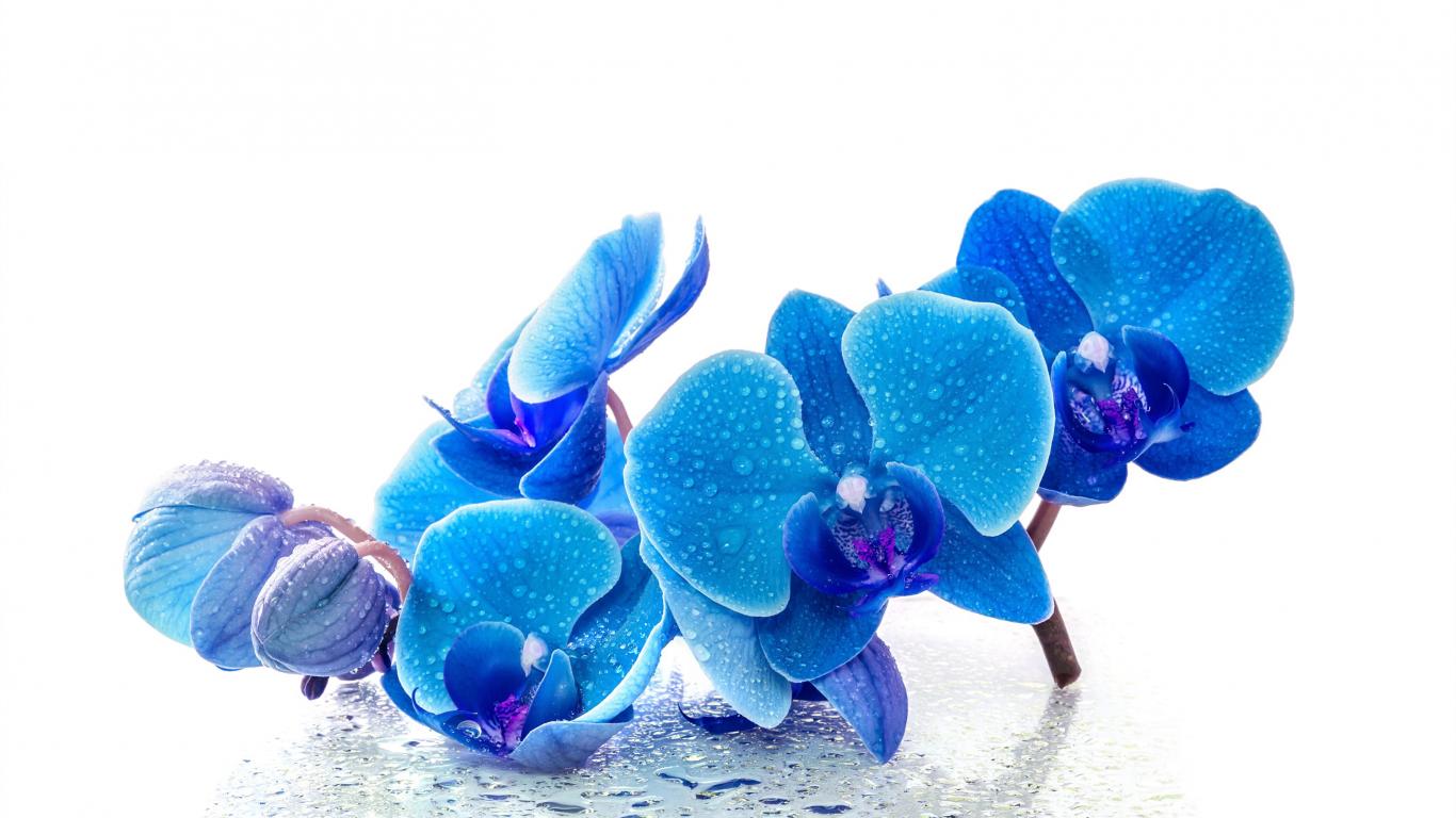 Обои Голубые экзотические орхидеи в каплях воды на белом фоне