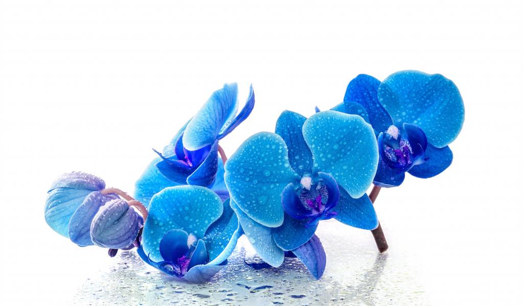 Обои Голубые экзотические орхидеи в каплях воды на белом фоне