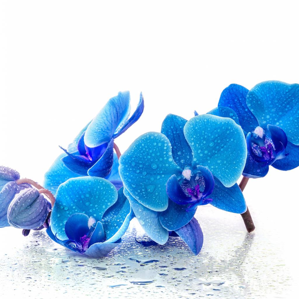 Обои Голубые экзотические орхидеи в каплях воды на белом фоне