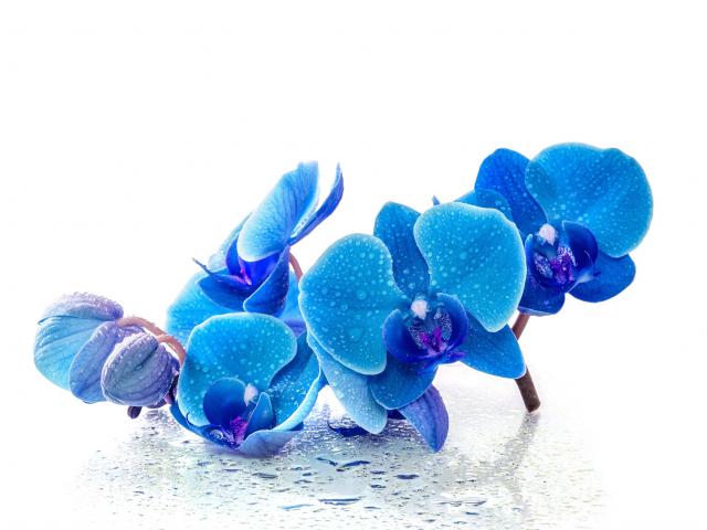 Обои Голубые экзотические орхидеи в каплях воды на белом фоне