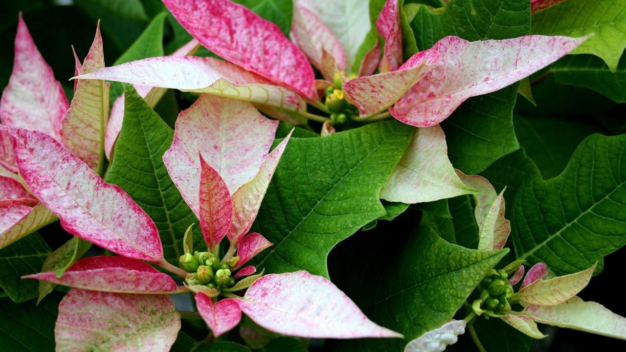 Обои Розовые цветы Пуансеттия с зелеными листьями