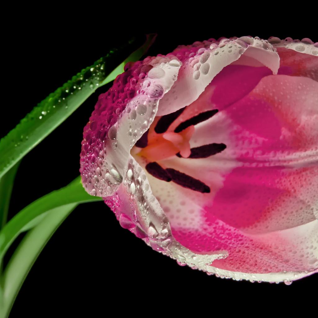 Обои Розовый тюльпан в каплях росы на черном фоне