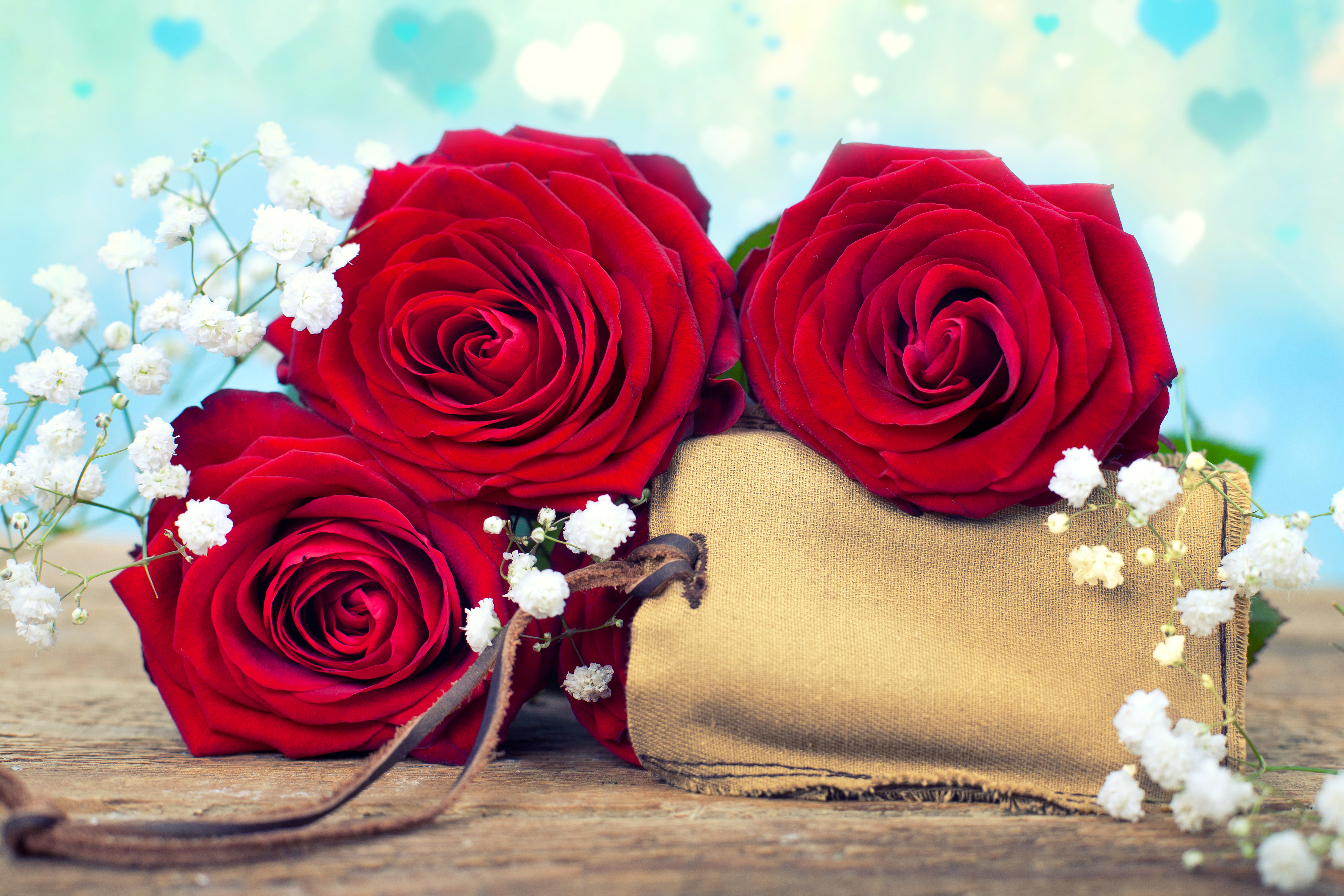Обои Три больших красных розы с тканевым мешочком