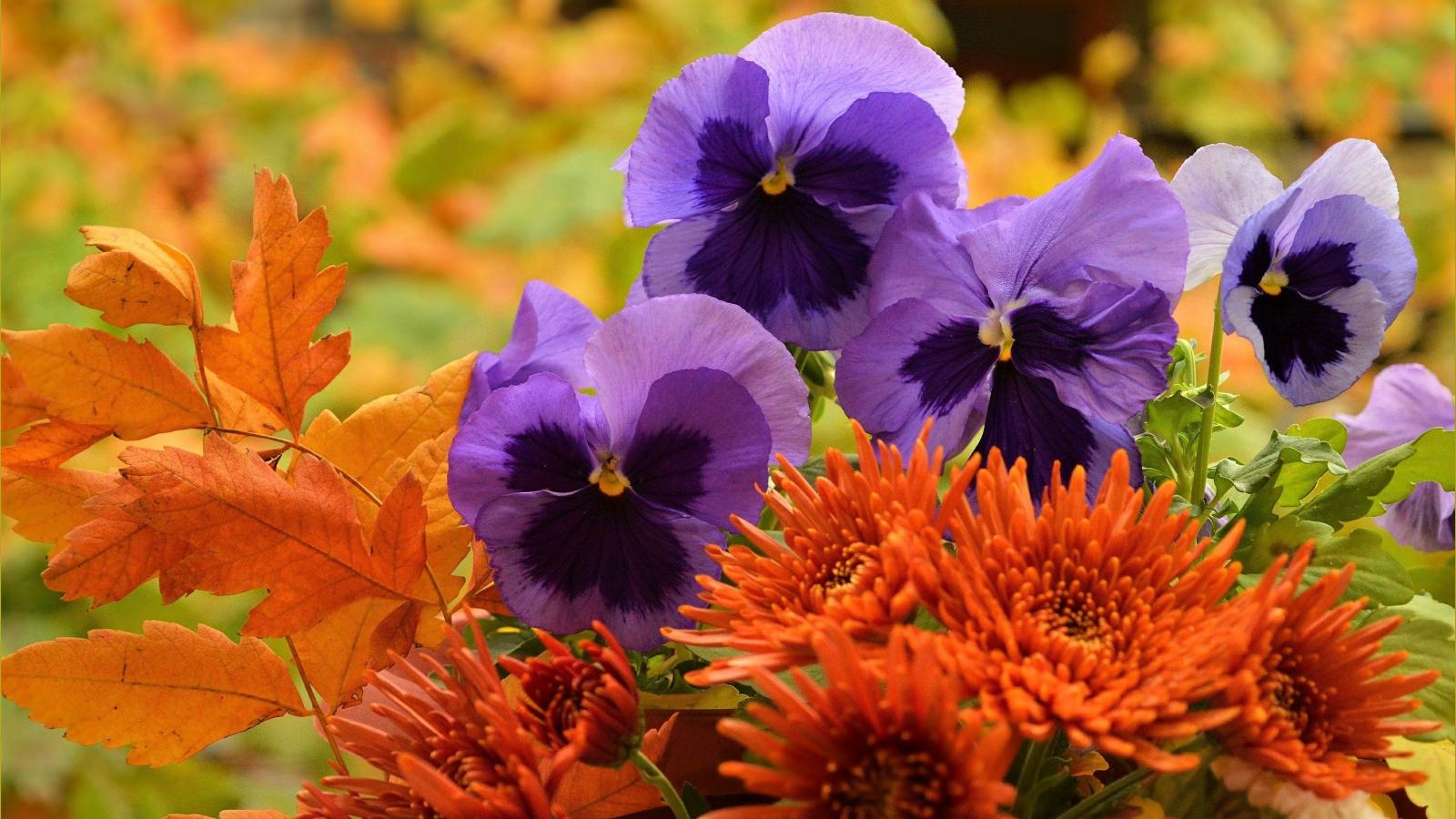 Обои Фиолетовые цветы анютины глазки с оранжевыми цветами хризантемы