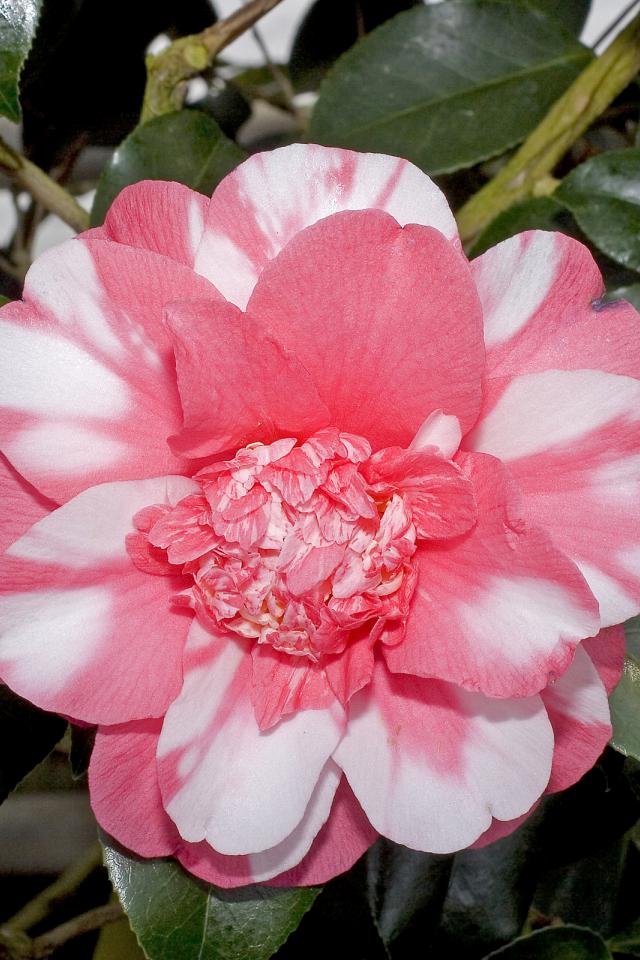 Обои Красивый розово-белый цветок камелии с зелеными листьями