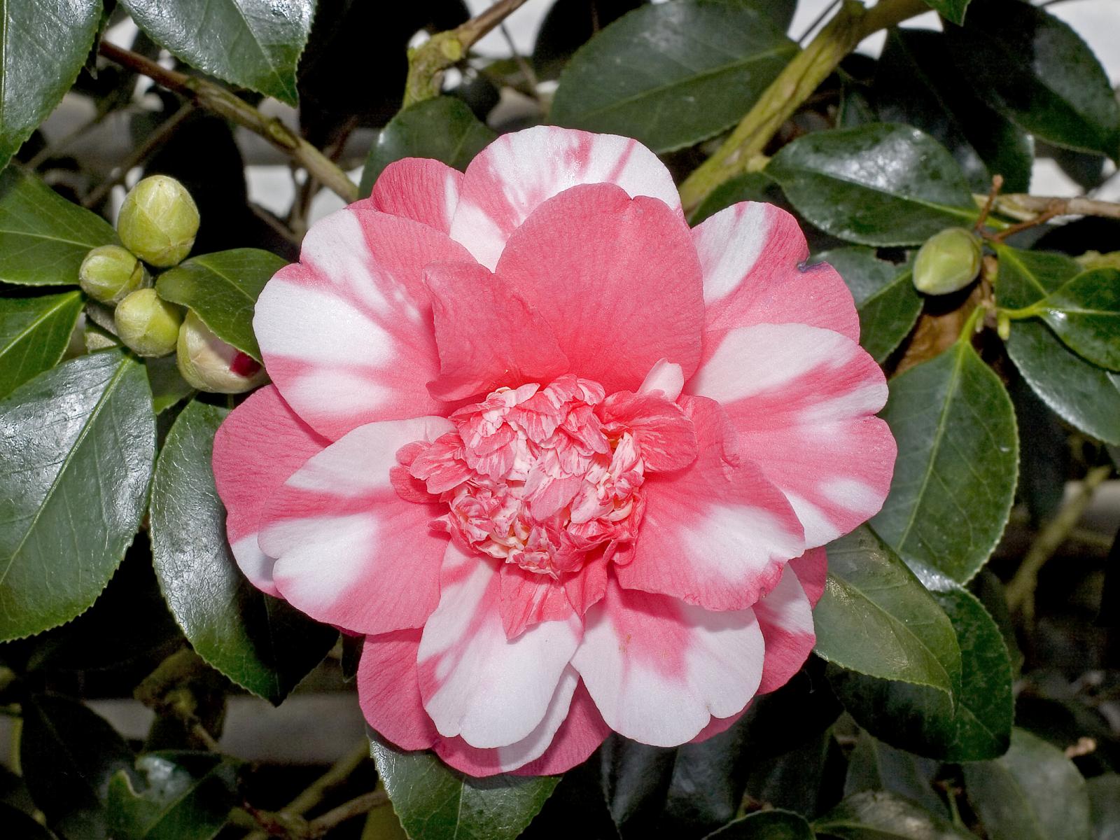 Обои Красивый розово-белый цветок камелии с зелеными листьями
