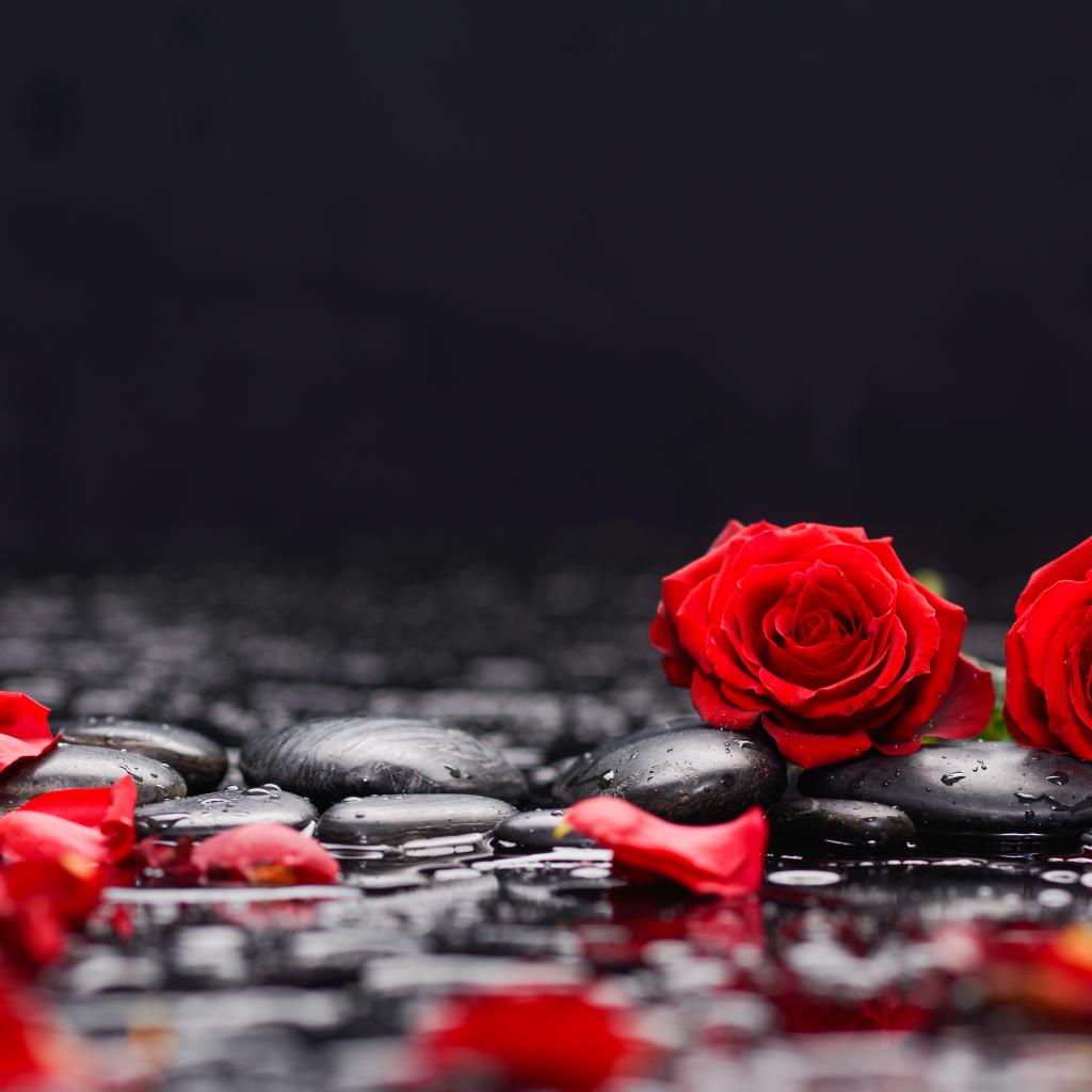 Обои Красные розы на черных камнях в воде