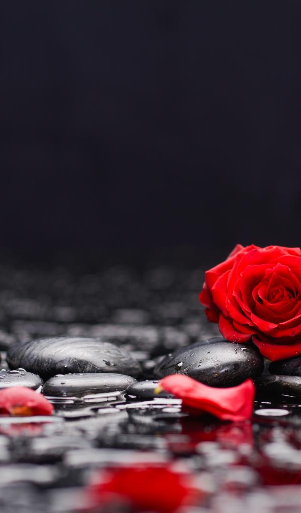 Обои Красные розы на черных камнях в воде
