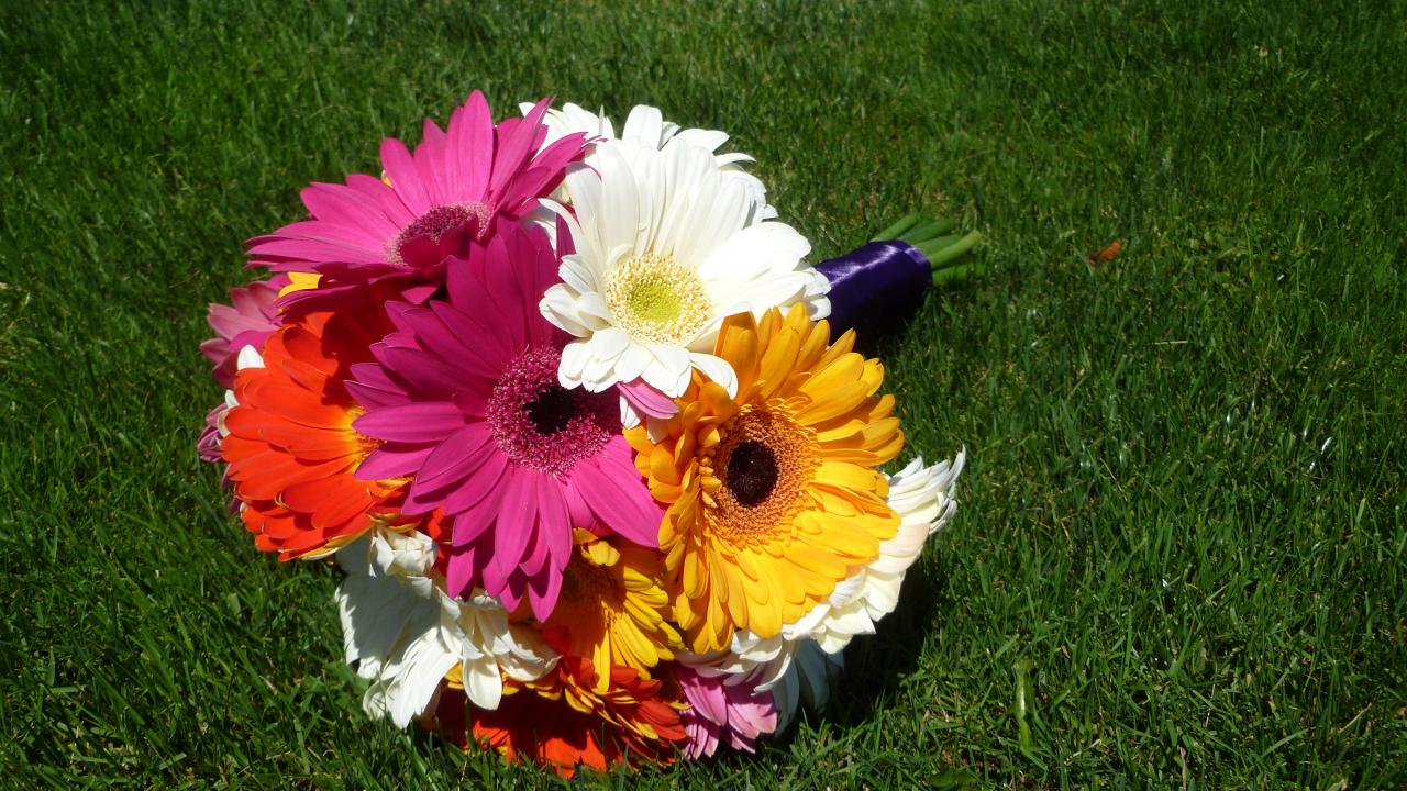 Обои Букет разноцветных гербер лежит на зеленой траве