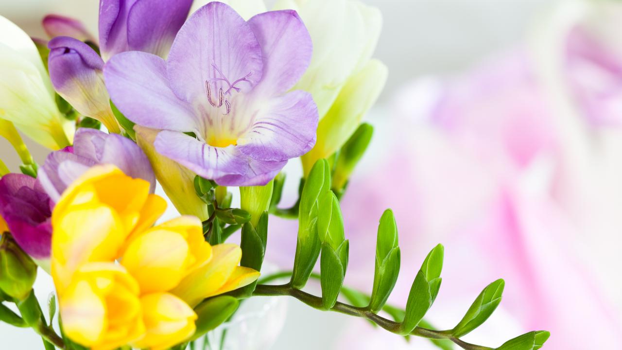Обои Желтые и сиреневые цветы фрезии