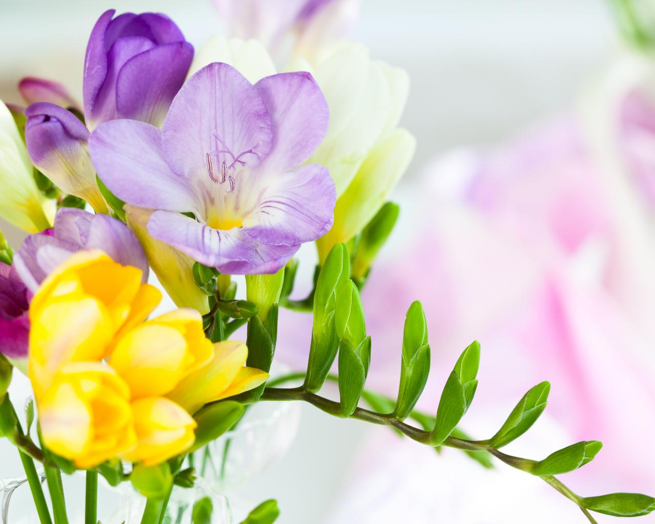 Обои Белые и фиолетовый цветы фрезии в лейке на белом фоне