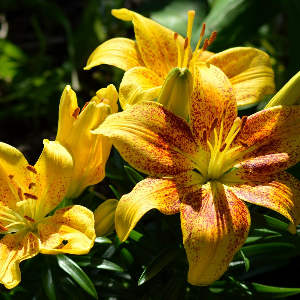 Обои Желтые пятнистые лилии на клумбе крупным планом