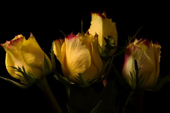 Обои Три желтые розы с зелеными листьями на черном фоне