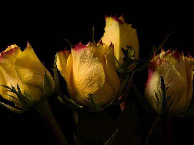 Обои Три желтые розы с зелеными листьями на черном фоне