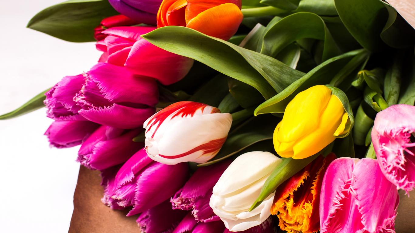 Обои Красивый букет разноцветных тюльпанов крупных планом