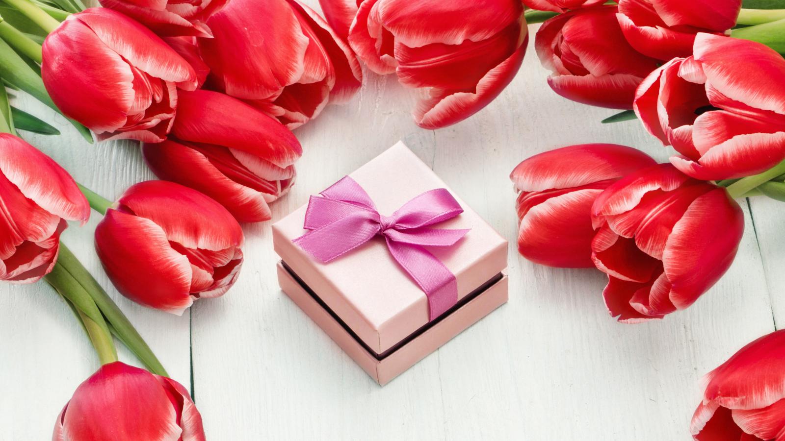 Обои Красные тюльпаны на деревянной поверхности с подарком