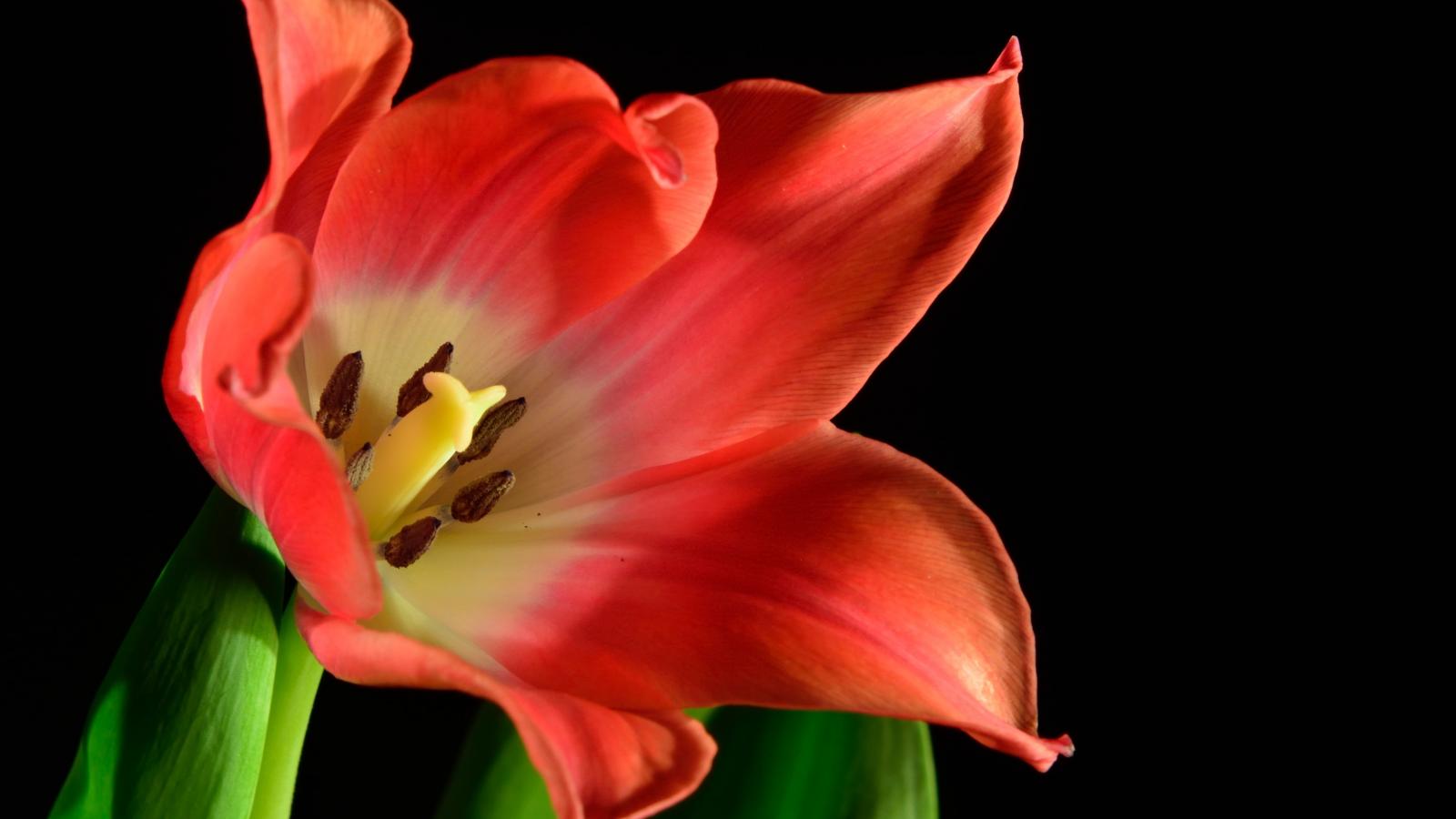 Обои Красный тюльпан с зелеными листьями на черном фоне