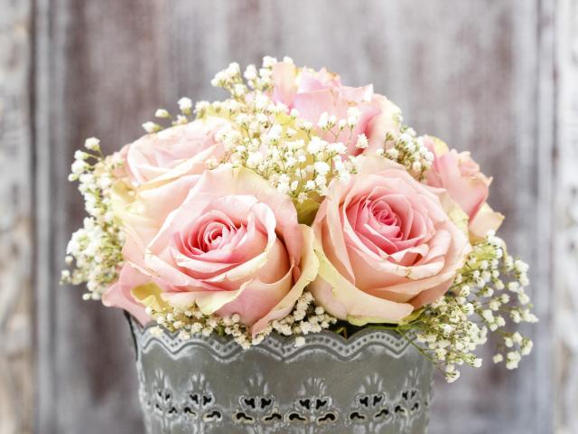 Обои Букет розовых роз с мелкими белыми цветами в вазе