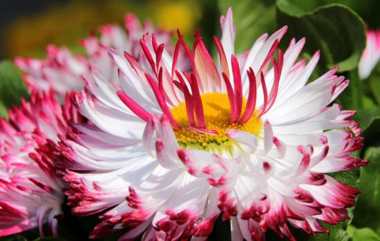 Обои Белые цветы маргаритки с красными лепестками и желтой серединкой