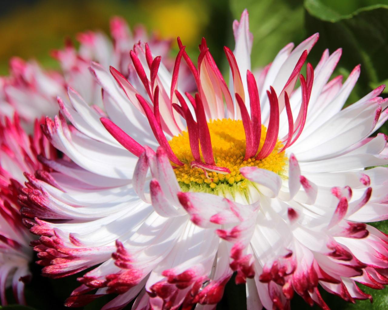 Обои Белые цветы маргаритки с красными лепестками и желтой серединкой