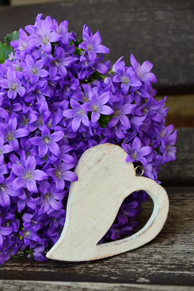 Обои Букет фиолетовых колокольчиков с деревянным сердечком