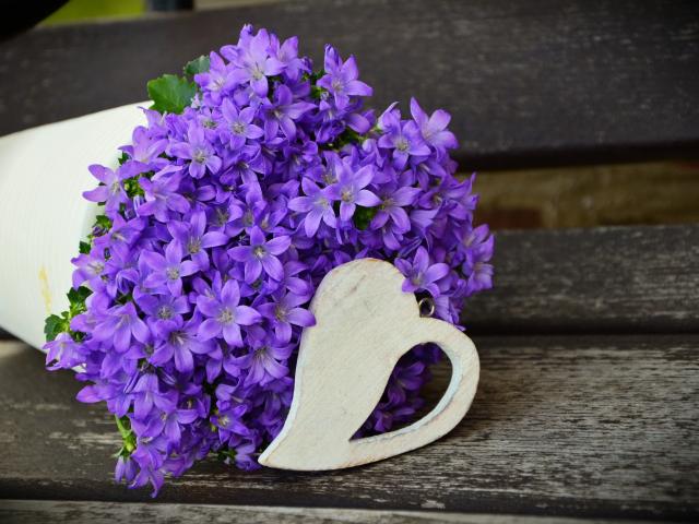 Обои Букет фиолетовых колокольчиков с деревянным сердечком