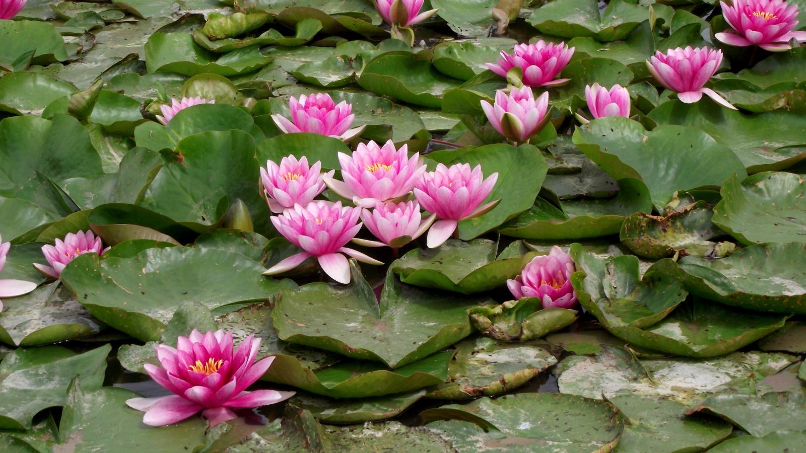 Обои Розовые водяные лилии с зелеными листьями в пруду