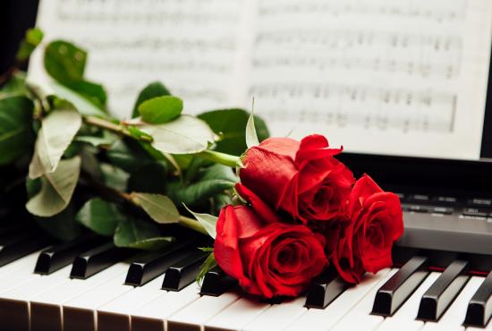 Обои Три красные розы лежат на клавишах пианино с нотами