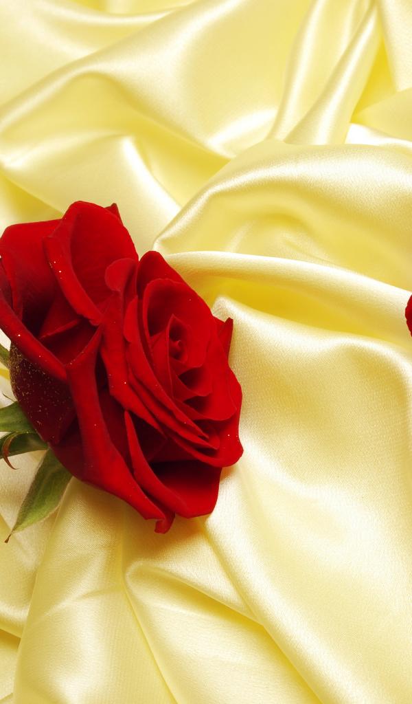 Обои Нежная красная роза на шелковом желтом покрывале