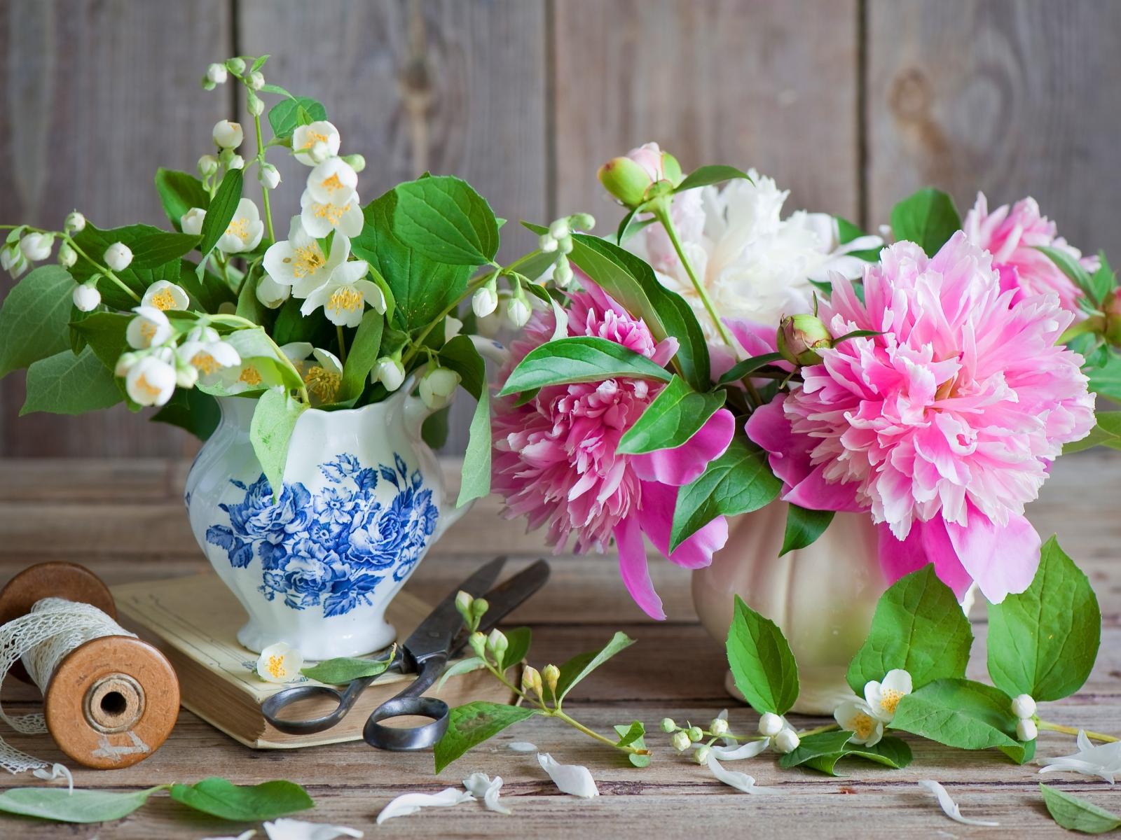 Обои Нежные цветы жасмина и пионов в вазе на столе