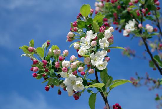 Обои Цветущая пышная ветка яблони на фоне голубого неба весной