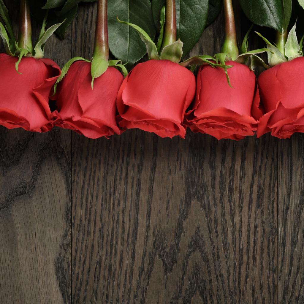 Обои Пять красных роз на деревянной поверхности, шаблон для открытки