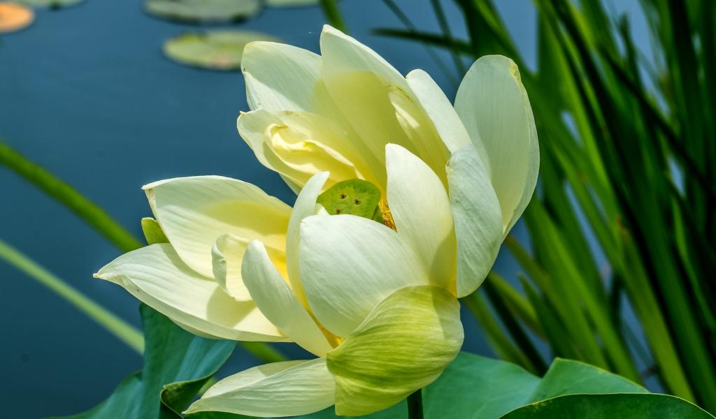 Обои Белый цветок лотоса в воде с зелеными листьями