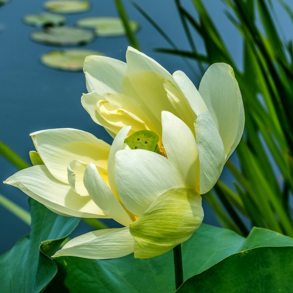 » Обои Белый цветок водяной лилии с зелеными листьями в пруду