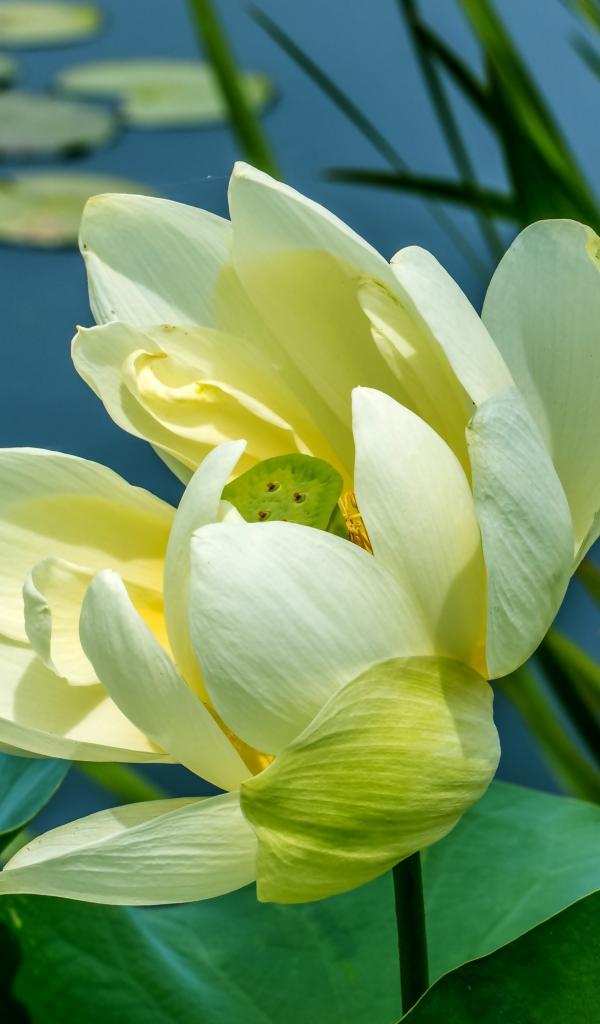 » Обои Белый цветок водяной лилии с зелеными листьями в пруду