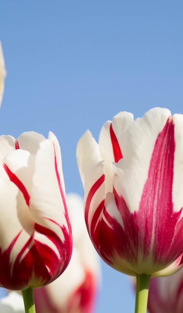 Обои Белые с красным тюльпаны на фоне голубого неба