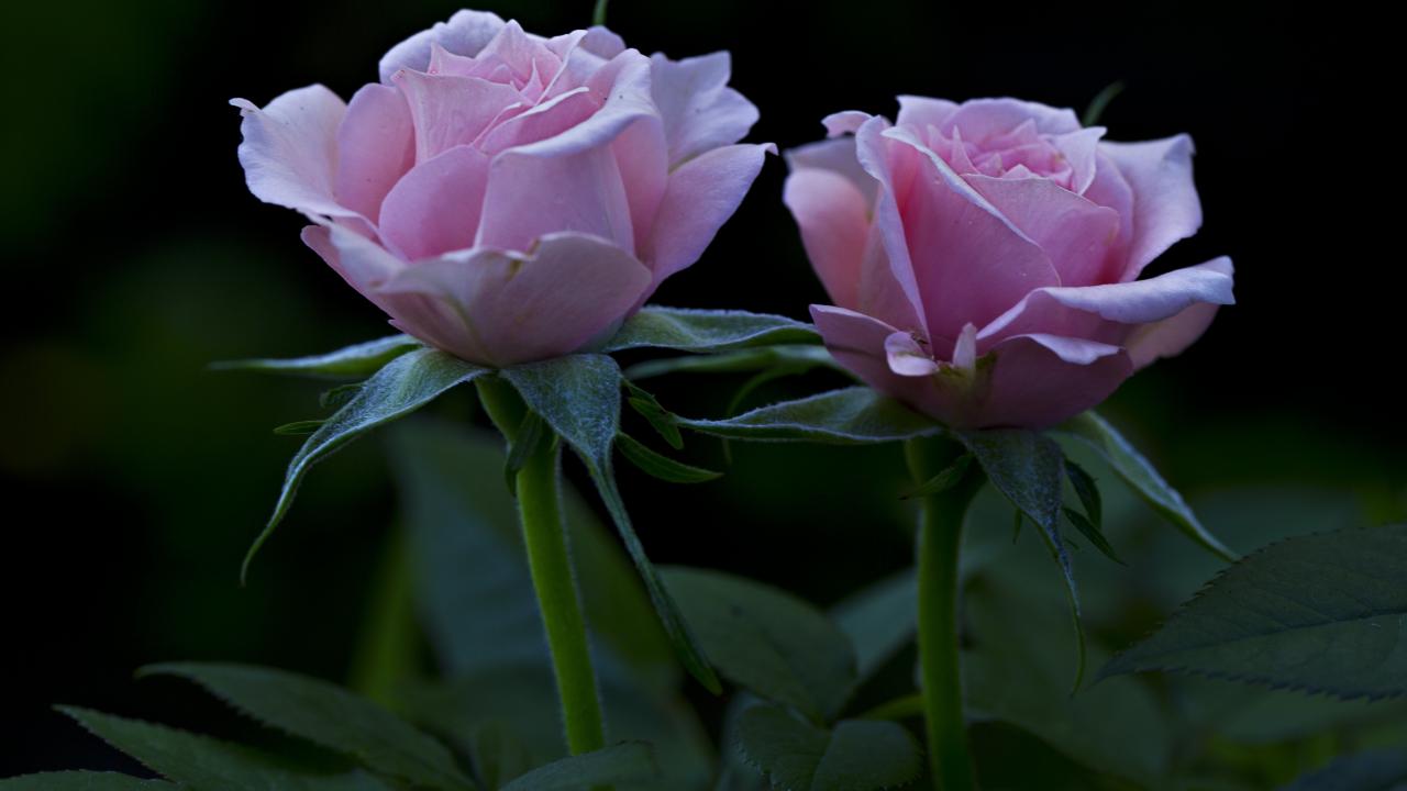 Обои Две красивых розовых розы на клумбе
