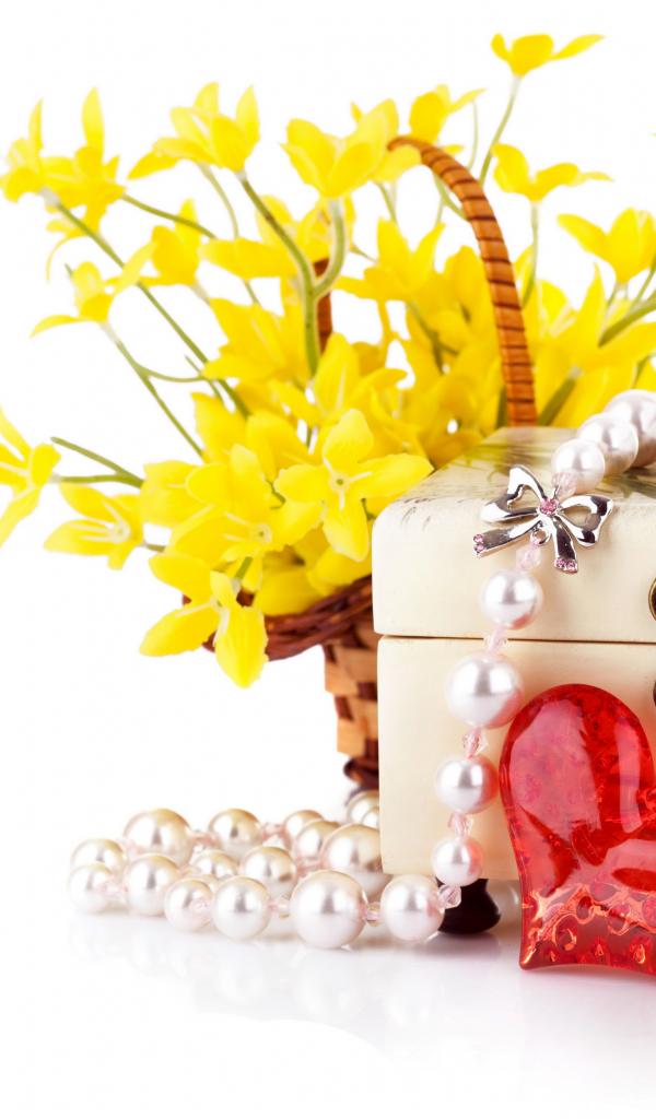 Обои Желтые цветы с подарками на белом фоне