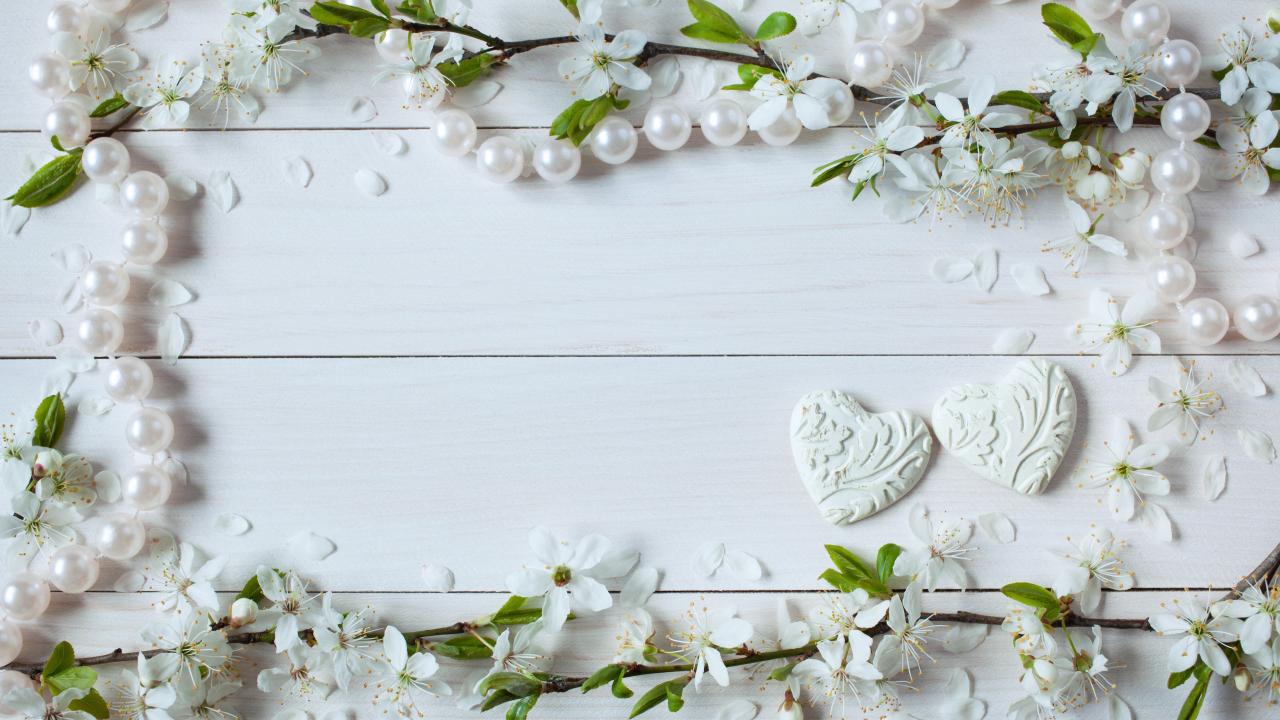 Обои Фон для поздравительной открытки с цветами вишни и жемчужными бусами