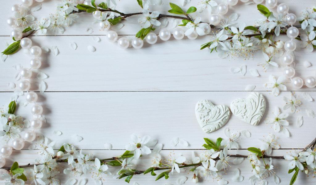 Обои Фон для поздравительной открытки с цветами вишни и жемчужными бусами