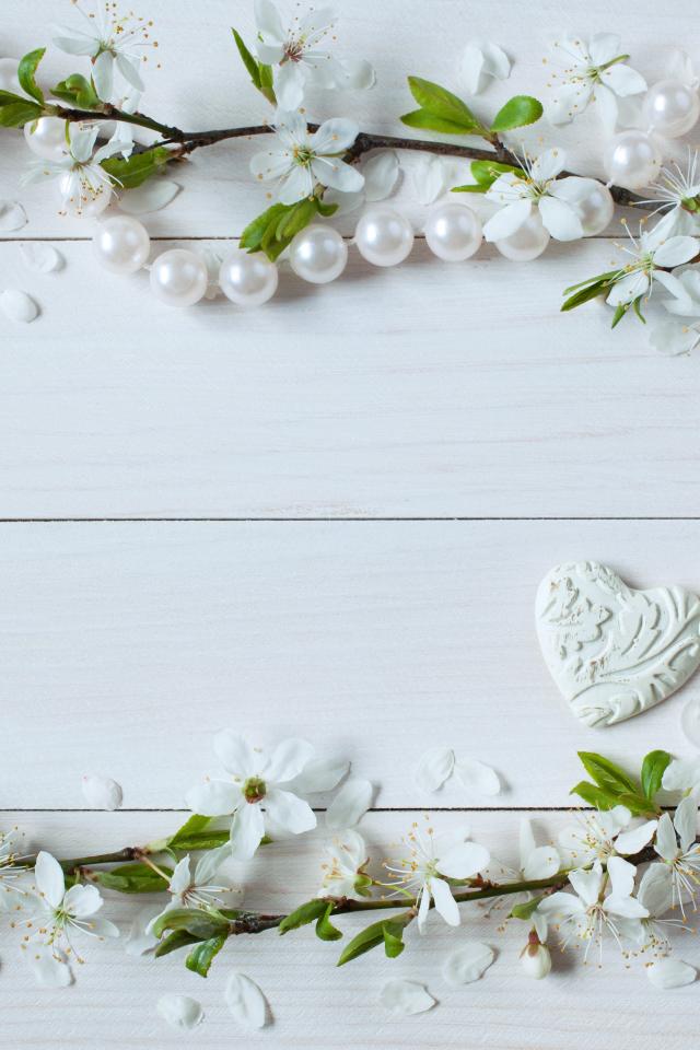 Обои Фон для поздравительной открытки с цветами вишни и жемчужными бусами