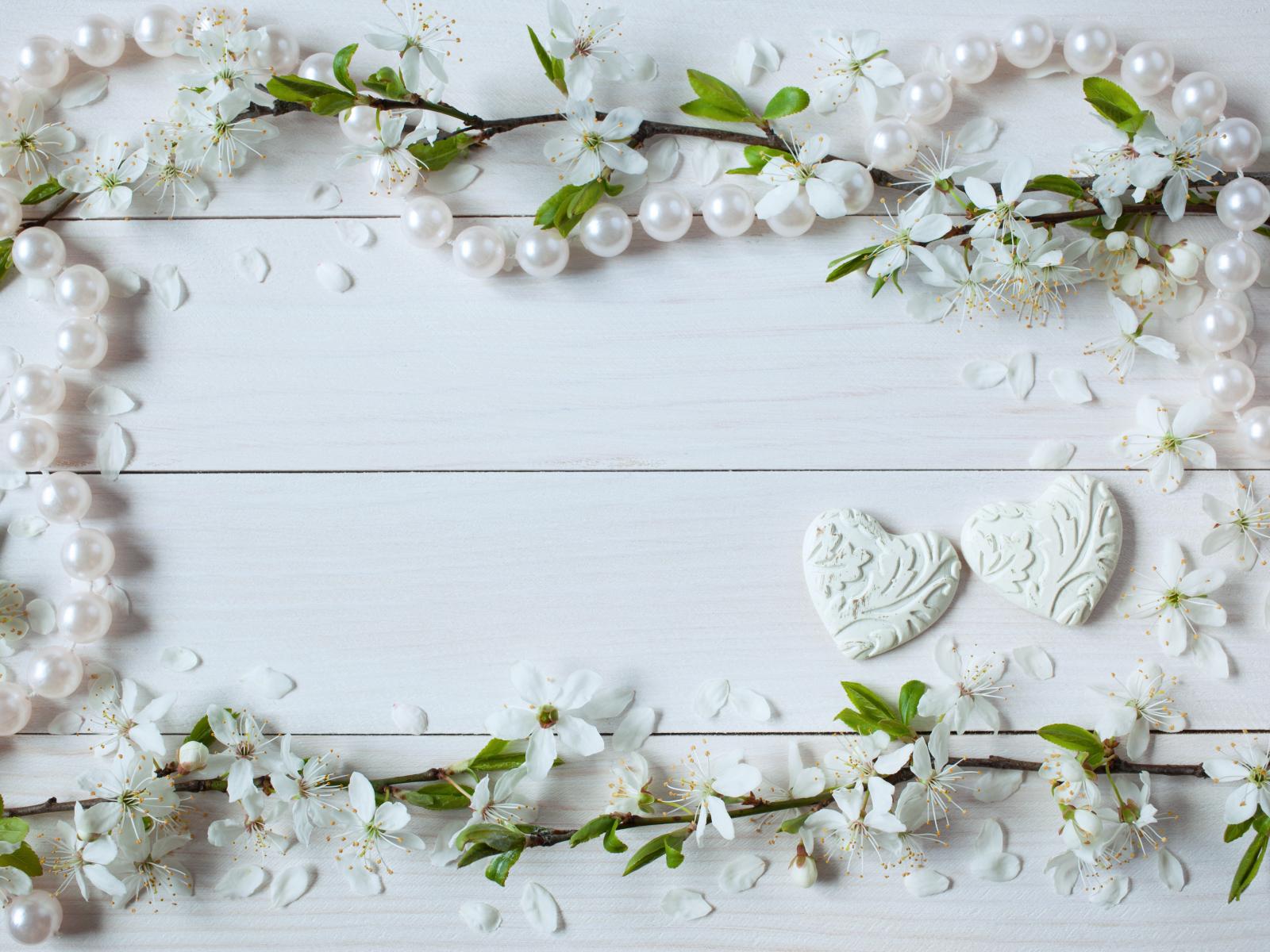 Обои Фон для поздравительной открытки с цветами вишни и жемчужными бусами