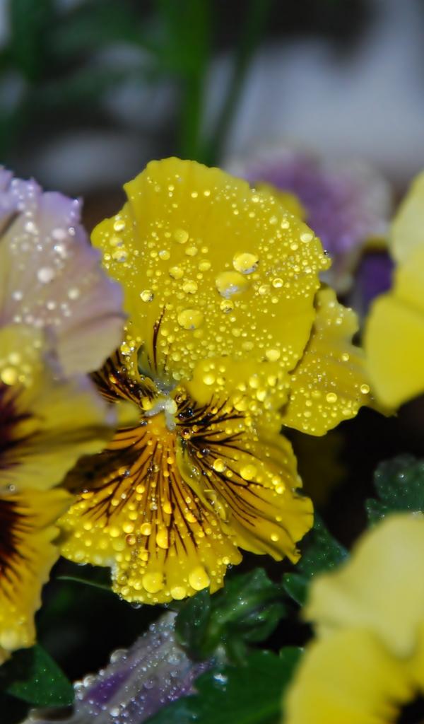 Обои Цветы анютины глазки в каплях росы