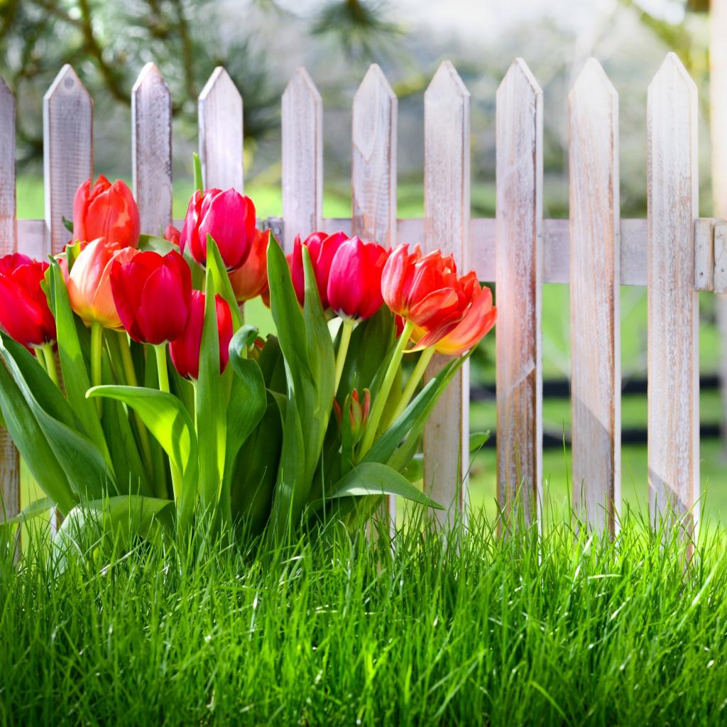 Обои Красивые тюльпаны в зеленой траве под забором