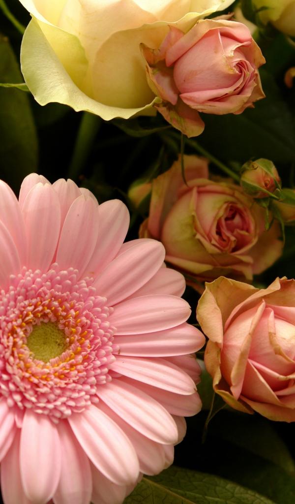 Обои Букет с розовыми герберами и розовыми розами